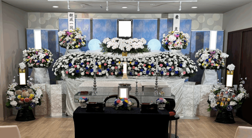 今回のご葬儀では、祭壇を青と白を基調にお飾りし、故人様が愛された故郷の自然を思わせるような雰囲気で祭壇をお作りしました。